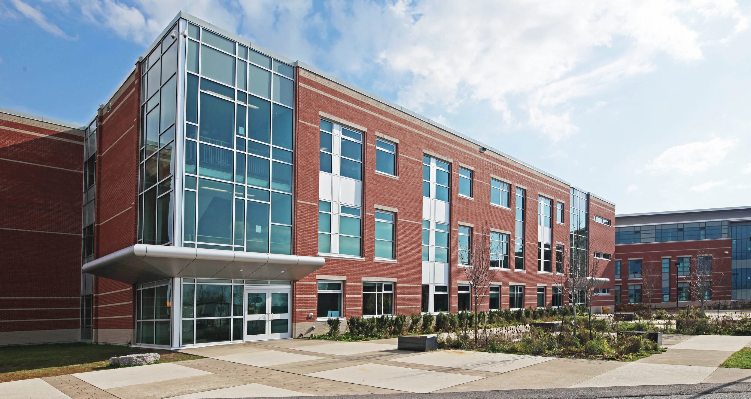 Student commons are provided on each floor, at the junctions between the existing building and new addition, in response to growing demands for mobile learning capacity. Large windows not only bring plenty of daylight into each classroom, but also frame breathtaking views of adjacent farmland and the sports fields outside. The new expanded courtyard has rectilinear pavement patterns which were achieved with a combination of interlocking pavers and stained concrete walkways. Stone benches and various vegetation are strategically arranged to promote a collaborative, vibrant and pleasant outdoor learning environment.